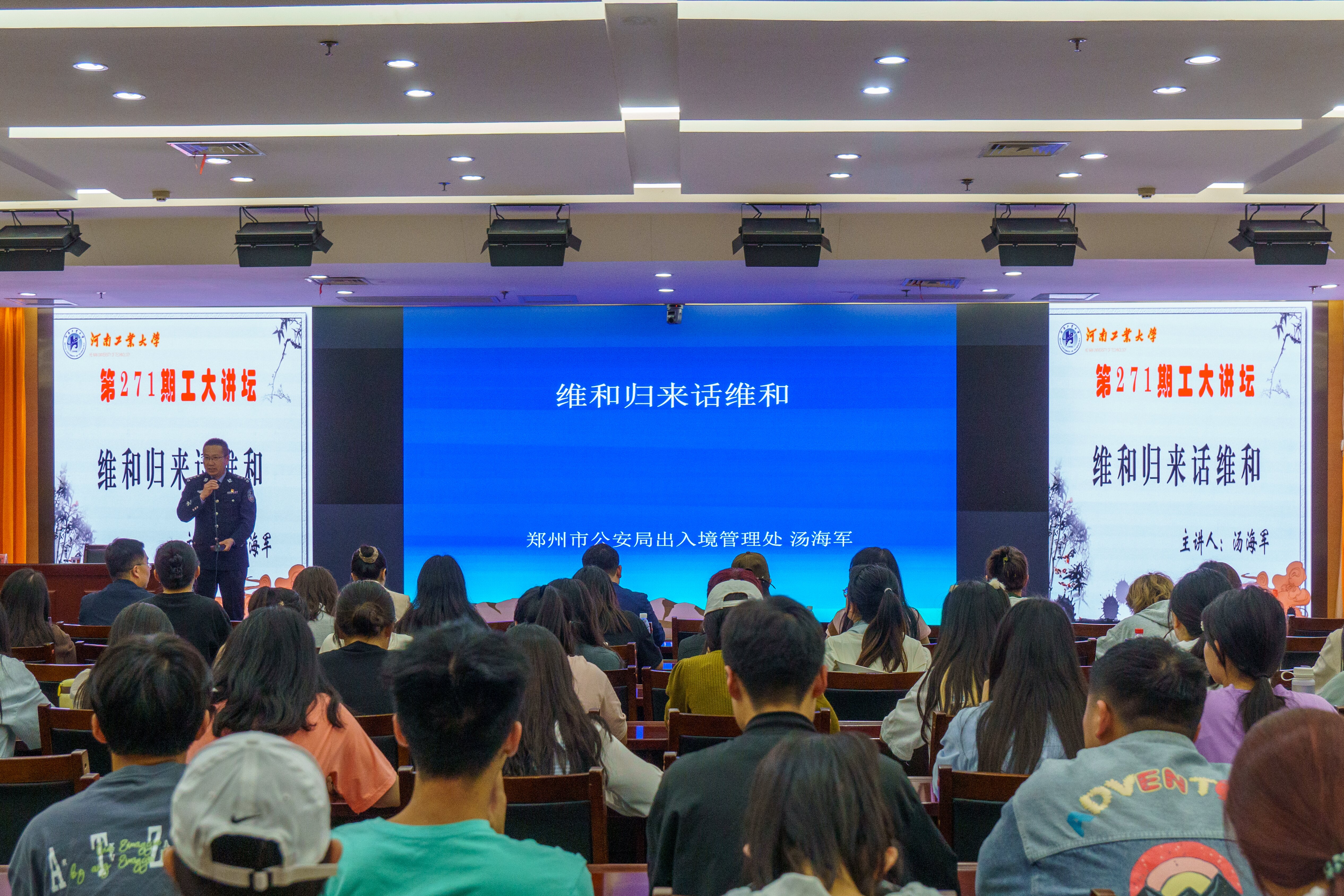 承办的第271期工大讲坛在学术报告中心D205报告厅举办。此次讲坛以“维和归来话维和”为题,特邀现任郑州市公安局出入境管理处副处长、北京师范大学刑事法律科学研究院法学博士、郑州大学外语学院英语硕士汤海军为主讲嘉宾。讲坛开始前,校党委宣传部部长黄泽峰、校团委副书记杨伟超、校党委宣传部副部长韩玉、色情小说