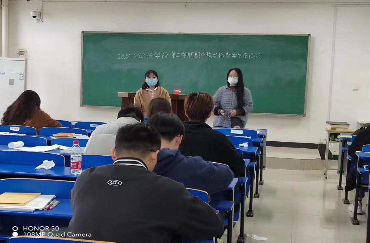 4月21日在3438教室召开了期中教学检查学生座谈会,院长助理南海燕、教学办杨青和学生代表参会;4月23日在学院3424会议室召开了教师座谈会,院党委书记韩永刚、院长张道许、院党委副书记许文和全体教师参会。