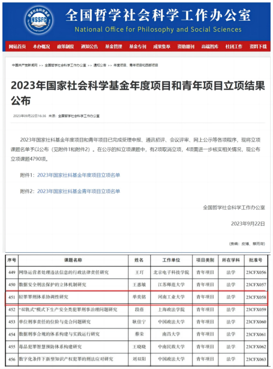 近日,全国哲学社会科学工作办公室发布2023年国家社会科学基金年度项目和青年项目评审结果,我院教师单奕铭博士申报的“轻罪罪刑体系协调性研究”获批国家社科基金青年项目立项。