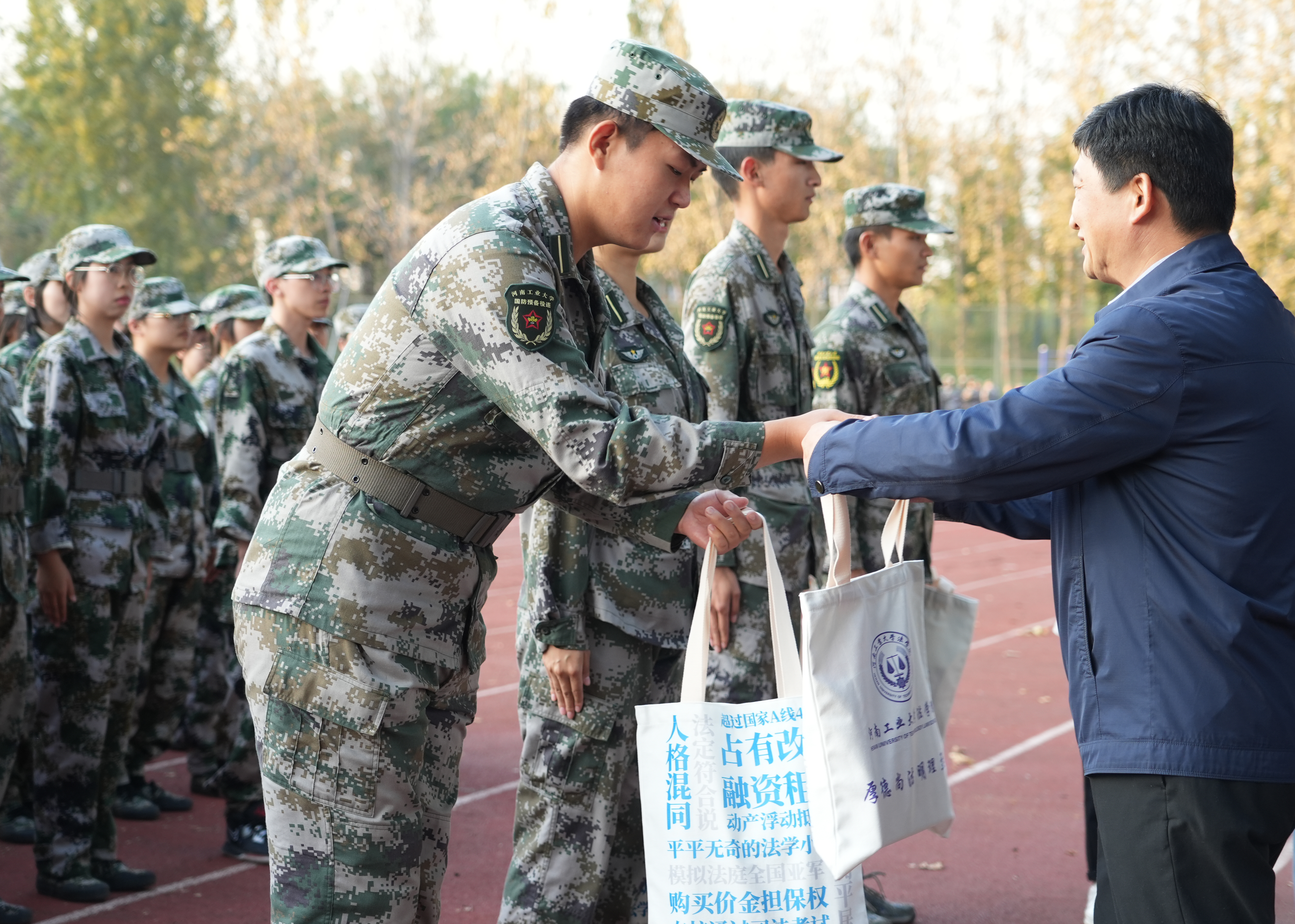 学子的精神面貌。随后,许文代表学院对辛苦训练的教官与学生表达了关心和鼓励,他表示,军训是国防教育的必修课,是弘扬爱国主义、磨炼意志品质的重要方式,学院高度重视学生军训工作,希望同学们珍惜训练机会,加强自我管理,强化团队合作,把艰苦奋斗、吃苦耐劳的作风带到今后学习生活中去,把成为社会主义事业建设者和接班人当做自己的奋斗目标。最后,学院领导老师为承训教官送上了学院精心准备的慰问品。