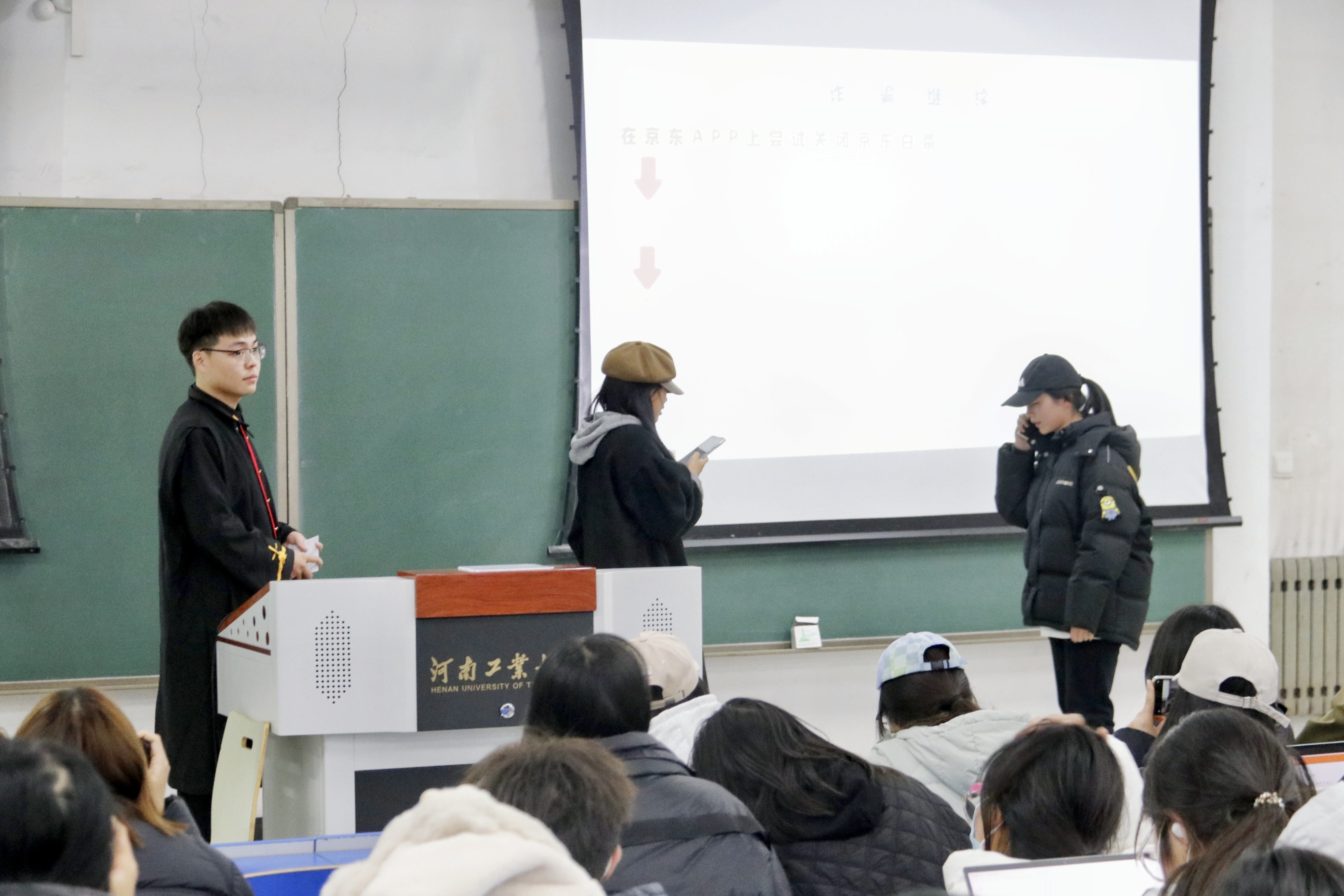 四组宣讲团成员结合当前大学生实际情况,依次从“真实案例讲解”“受骗原因分析”“诈骗防范建议”“法律责任划定”四个方面以生动有趣的形式展开宣讲。现场情景剧化的经典案例呈现、原创诈骗情景VCR的播放以及小品与反诈rap的演绎,宣讲团成员以多样的形式和详实的内容诠释电信诈骗的手段和危害,深化同学们对网络诈骗的认知,警示大家提升防范意识。