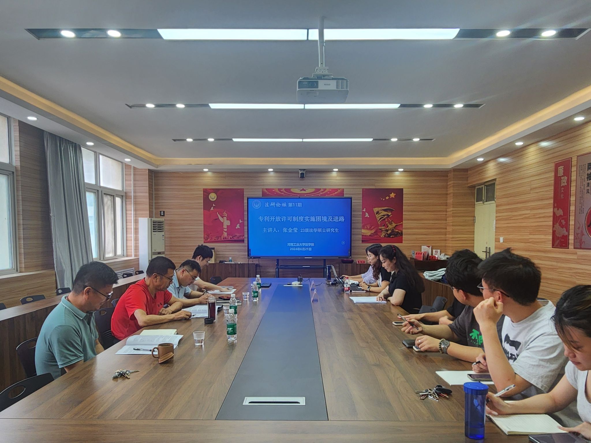 在3424会议室成功举办“法研论坛”第11期学术研讨会。2023级法学硕士研究生张金莹围绕“专利开放许可制度的实施困境及进路”作主题分享。本次会议邀请硕士生导师陈政副教授、陈辉副教授、苏冬冬博士担任评议人,李文江教授担任总结人。会议由2023级法学硕士研究生方真真主持,2023级全体研究生参加会议。