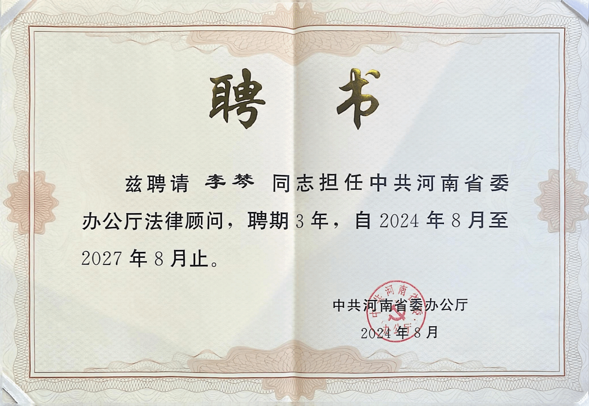 李棽是第三次担任中共河南省委办公厅法律顾问。会上,曾德亚充分肯定了李棽前期为促进河南法治建设和社会和谐稳定所作出的积极贡献;希望法律顾问聚焦“两个确保”“十大战略”,主动作为、尽职尽责,在服务省委重大决策上积极建言献策,对重要地方立法事项进行科学严谨论证,在推进党内法规制度建设上彰显更大作为,在处置具体涉法事务上提供专业法律意见,为推进中国式现代化建设河南实践贡献智慧力量。文:庞文娟/审校:张翠华/审核:许文