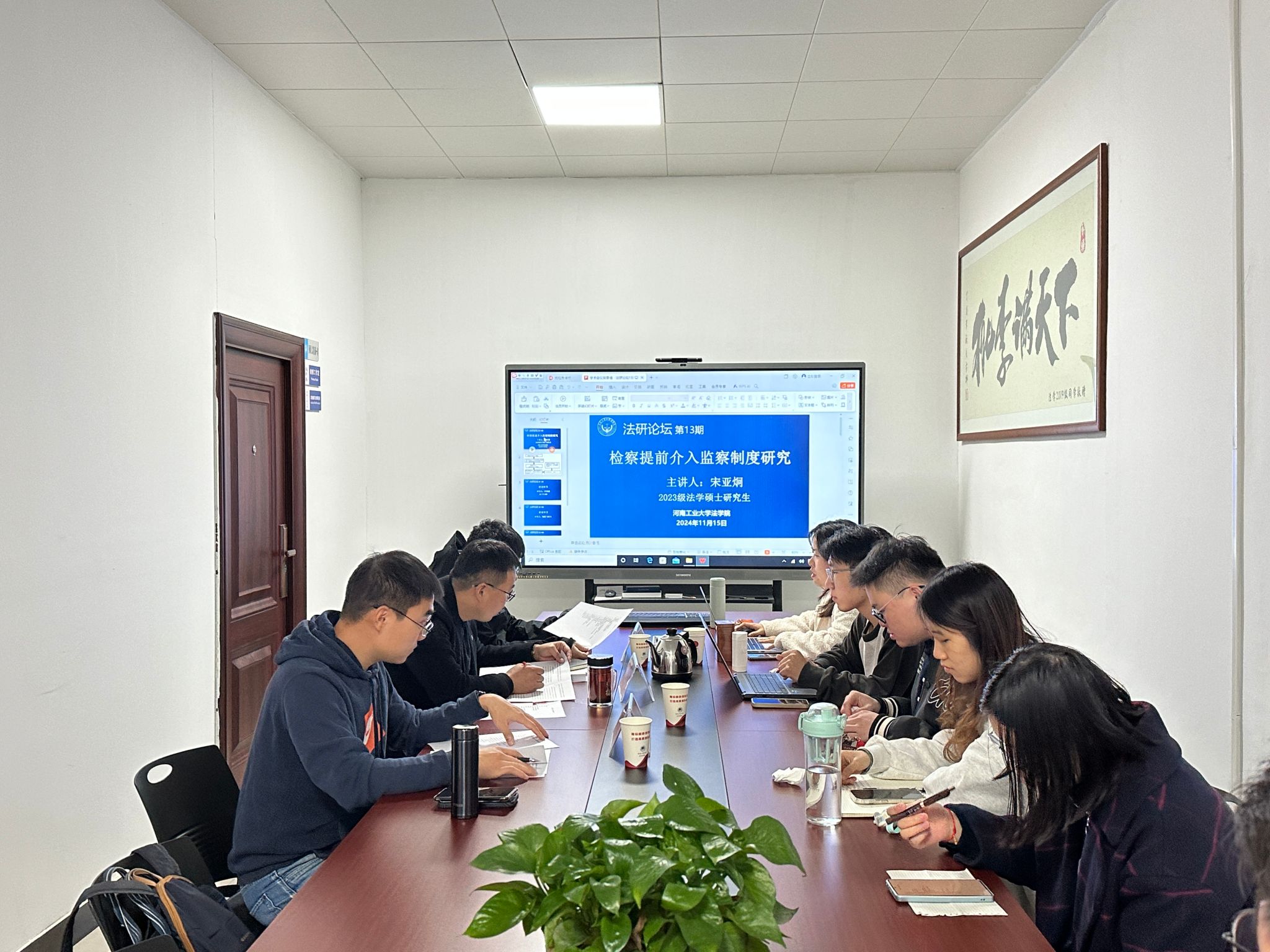 在3116研讨室成功举办“法研论坛”第13期学术研讨活动。此次活动由2023级法学硕士研究生组织,邀请硕士生导师单奕铭博士和陶泽飞博士担任评议人,硕士生导师陈辉副教授担任总结人。2023级法学硕士研究生宋亚炯围绕“检察提前介入监察制度”作主题分享,2023级全体法学硕士研究生参加会议。会议由2023级法学硕士研究生杨川主持。