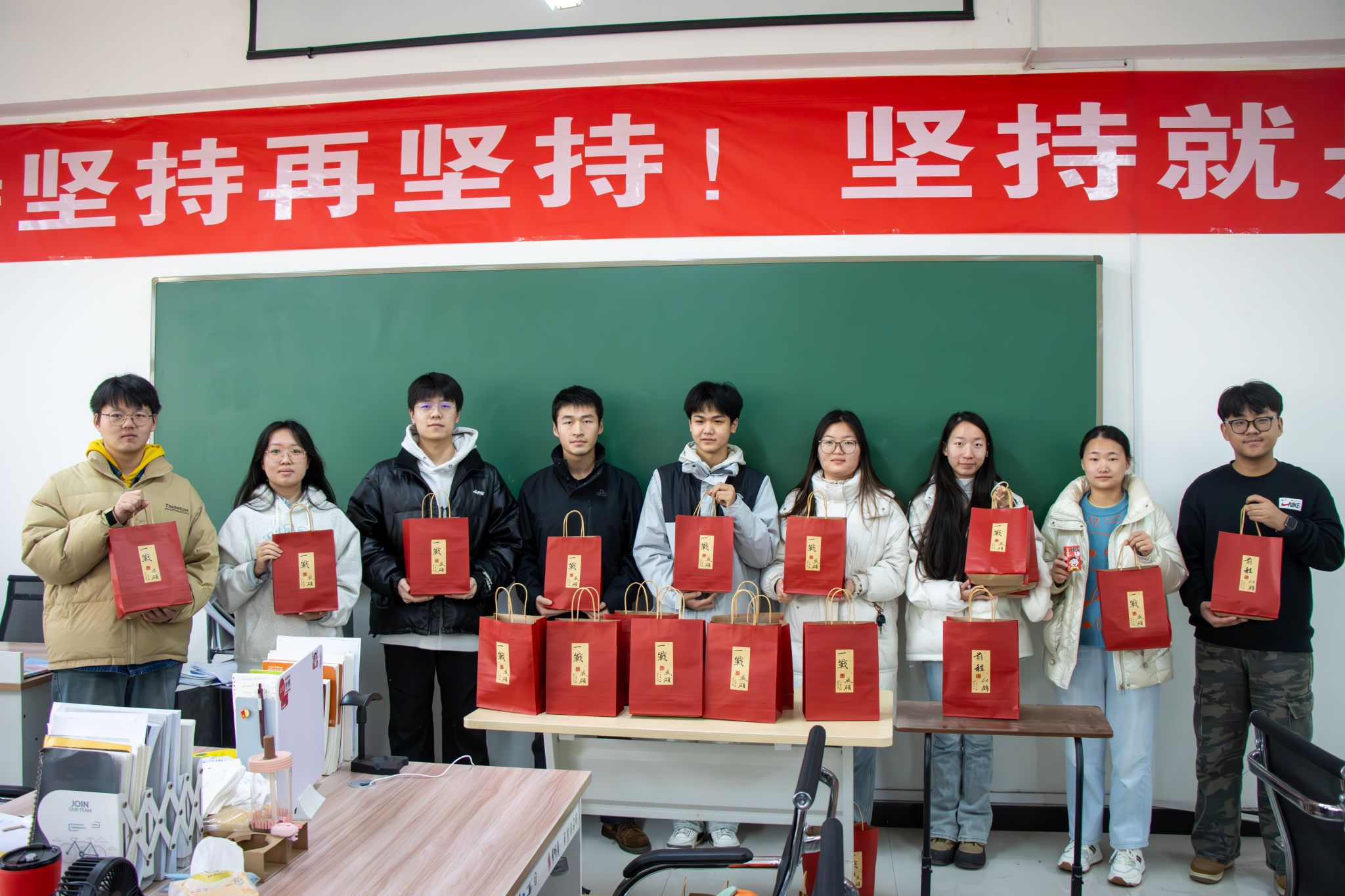 党委书记许文鼓励同学们,要善用系统思维将书本读“薄”,及时查漏补缺巩固要点,同时要以饱满的热情和坚定的决心迎接挑战,书写属于自己的辉煌篇章。院长张道许提醒同学们,在努力学习的前提下,注意身体,确保有良好的身体素质面对高强度的学习压力,希望大家能在应考前调整好心态,合理规划剩余复习时间。随后,学院领导为同学们发放了含有一战“橙”硕-脐橙、好运“旺旺”-旺仔牛奶、平稳上岸-苹果、百事大吉-百事可乐等物品的“暖心加油包”。