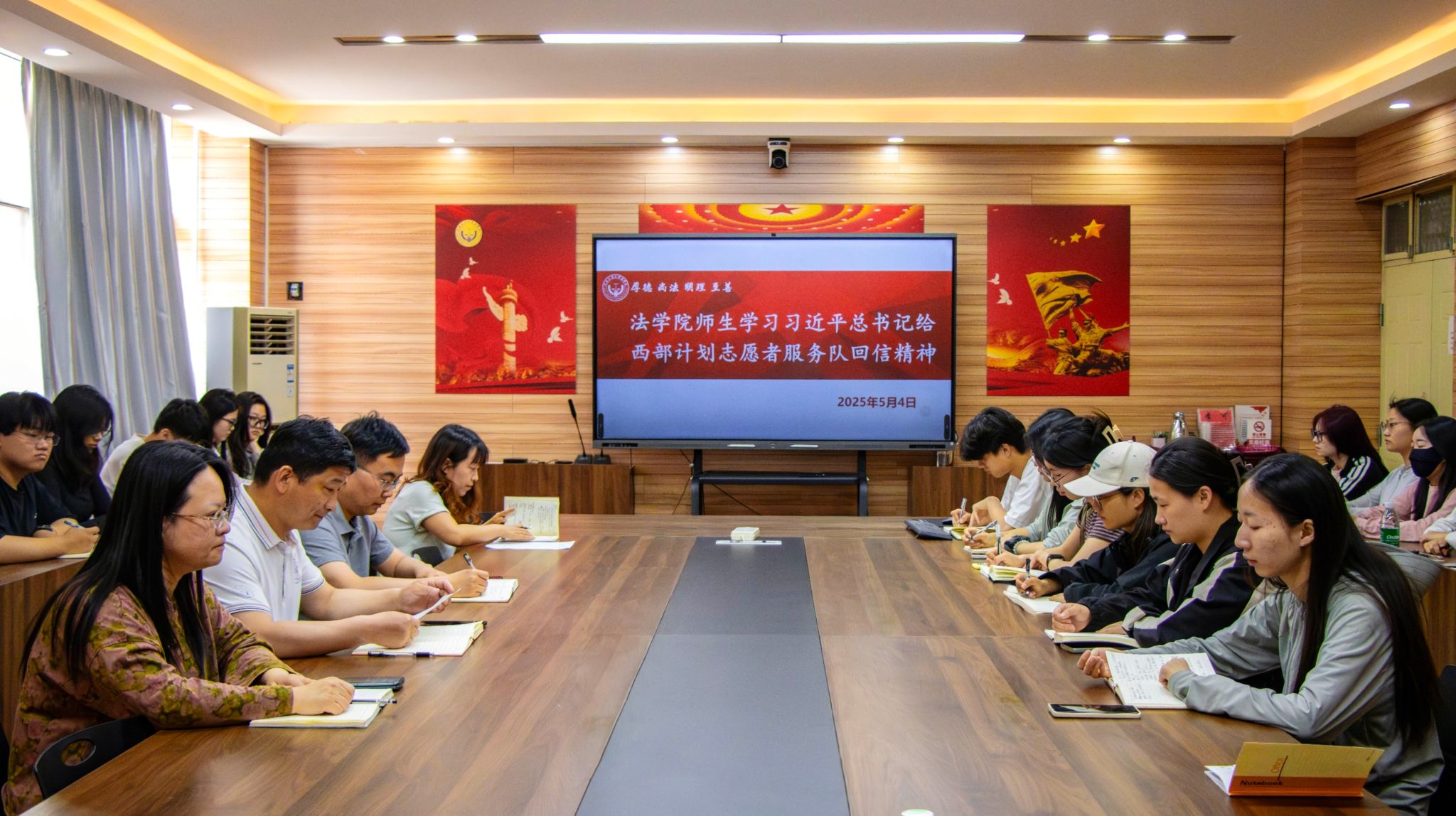 于5月4日在3424会议室集体学习习近平总书记给谢依特小学戍边支教西部计划志愿者服务队队员的回信。学院党委书记许文、院长张道许、副院长南海燕、学生党员、2025届西部计划志愿者及团委、学生会工作人员共50余人参加学习。学习会由学院团委副书记周静主持。