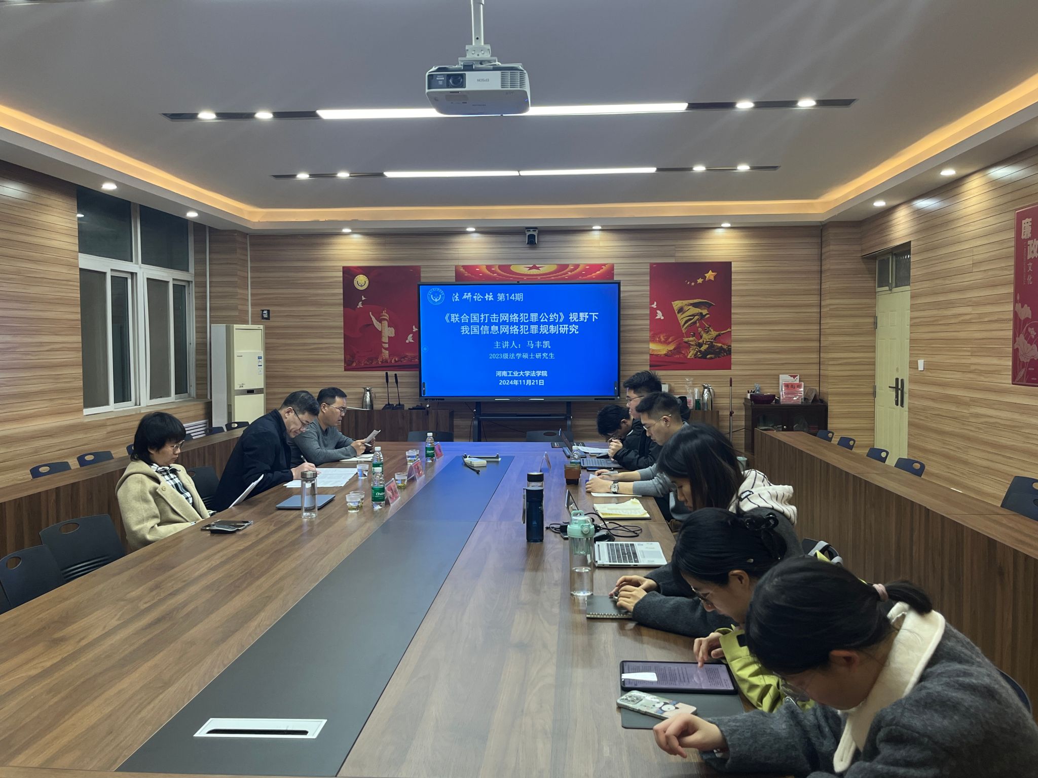 在3424会议室成功举办“法研论坛”第14期学术研讨活动。此次活动由2023级法学硕士研究生组织,邀请硕士生导师陈辉副教授和孙潇琳博士担任评议人,硕士生导师王君祥教授担任总结人。2023级法学硕士研究生马丰凯围绕着“《联合国打击网络犯罪公约》视野下我国信息网络犯罪规制研究”作主题分享,2023级全体法学硕士研究生参加会议。会议由2023级法学硕士研究生宋亚炯主持。