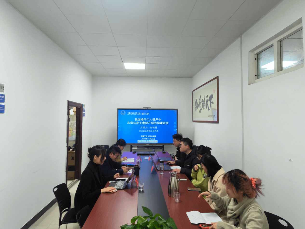 在3116研讨室成功举办“法研论坛”第15期学术研讨会。本次论坛邀请硕士生导师苏芸芳博士和高清浅博士担任评议人,硕士生导师陈政副教授担任总结人。2023级法学硕士研究生向长青围绕着“我国婚内个人破产中非常法定夫妻财产制的构建研究”作主题分享,2023级法学硕士研究生参加论坛。论坛由2023级法学硕士研究生马丰凯主持。