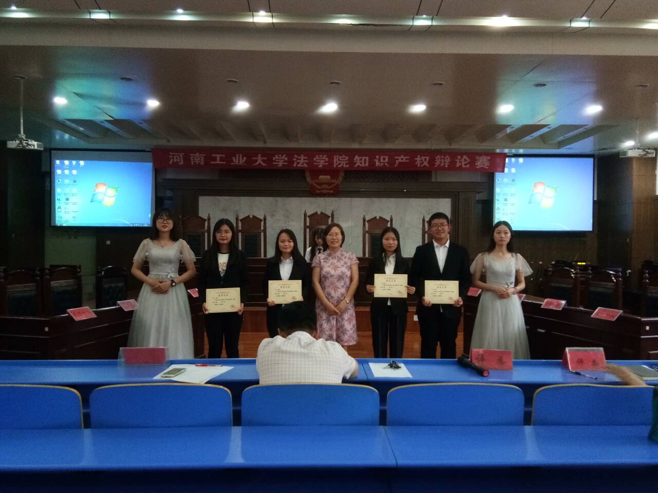 党委副书记张小彩、团委书记赵静、18级辅导员张培和知识产权法任课老师李文江、穆向明莅临比赛现场,担任决赛评委和嘉宾。